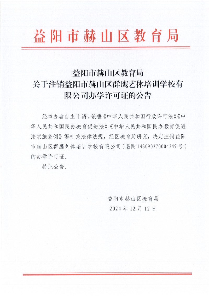 关于注销益阳市赫山区群鹰艺体培训学校有限公司办学许可证的公告