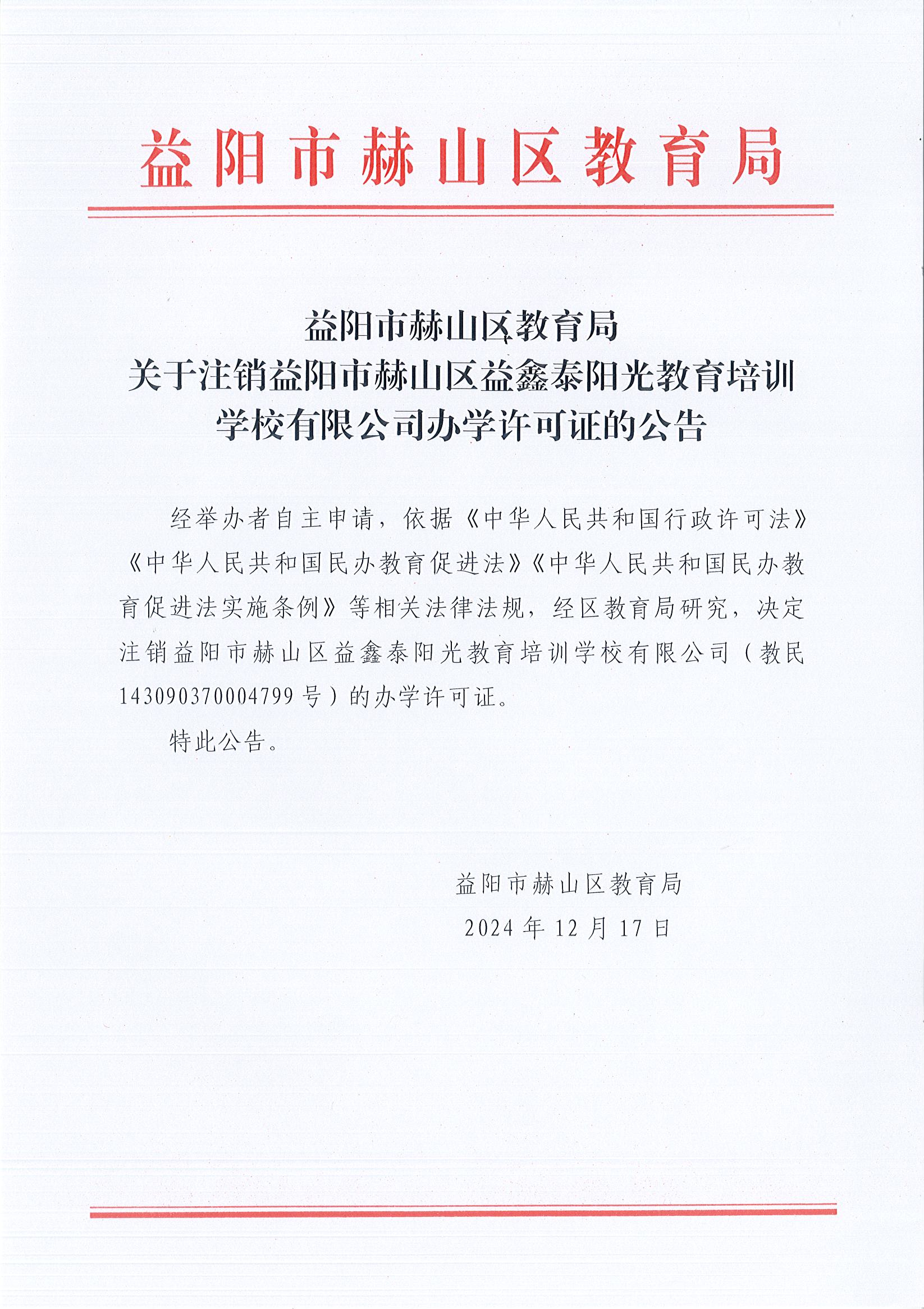 关于注销益阳市赫山区益鑫泰阳光教育培训学校有限公司办学许可证的公告