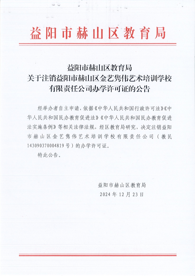关于注销益阳市赫山区金艺隽伟艺术培训学校有限责任公司办学许可证的公告