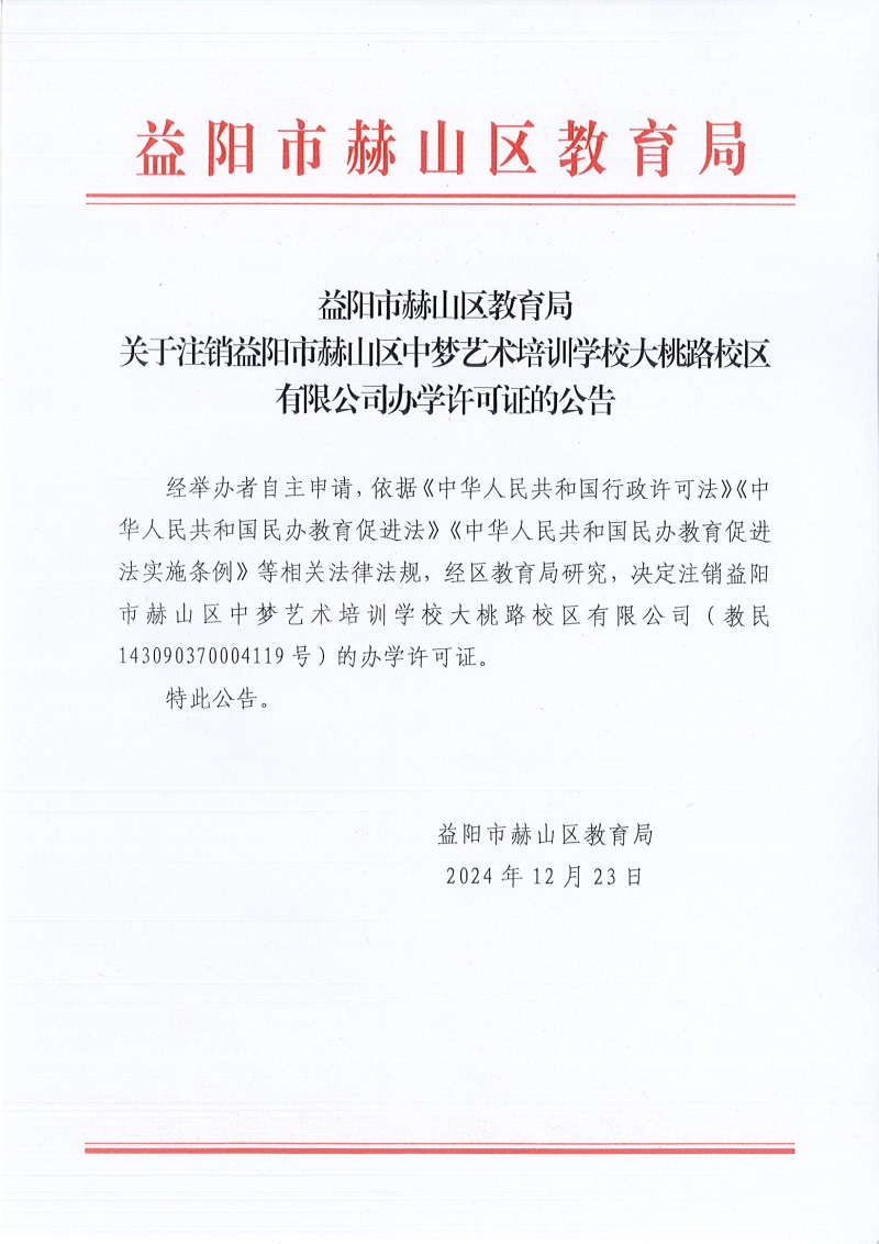 关于注销益阳市赫山区中梦艺术培训学校大桃路校区有限公司办学许可证的公告