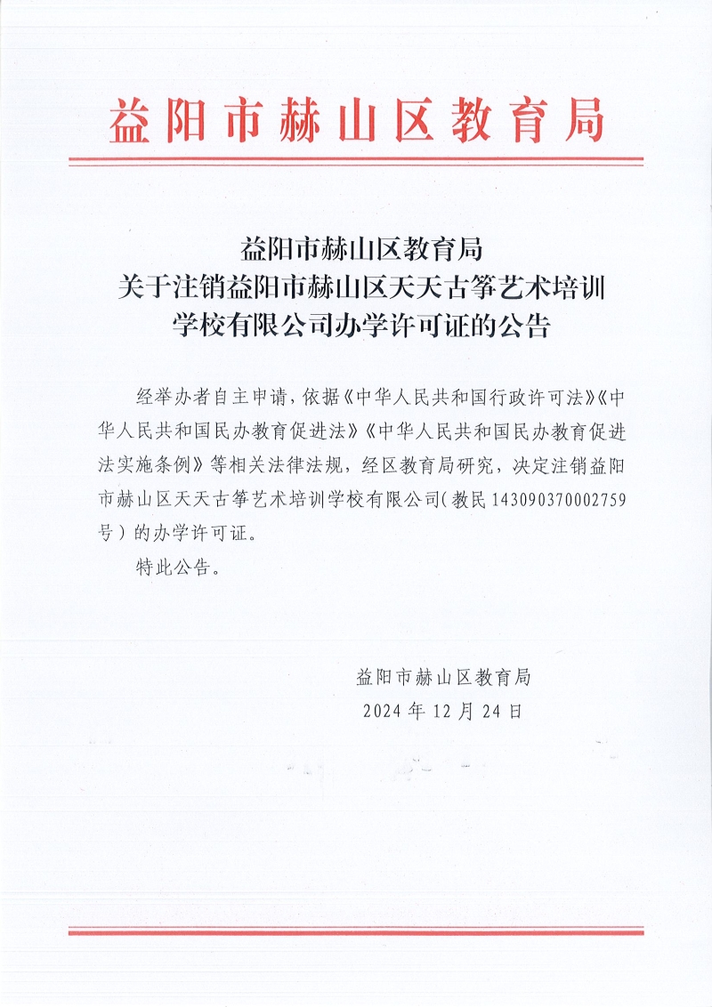 关于注销益阳市赫山区天天古筝艺术培训学校有限公司办学许可证的公告