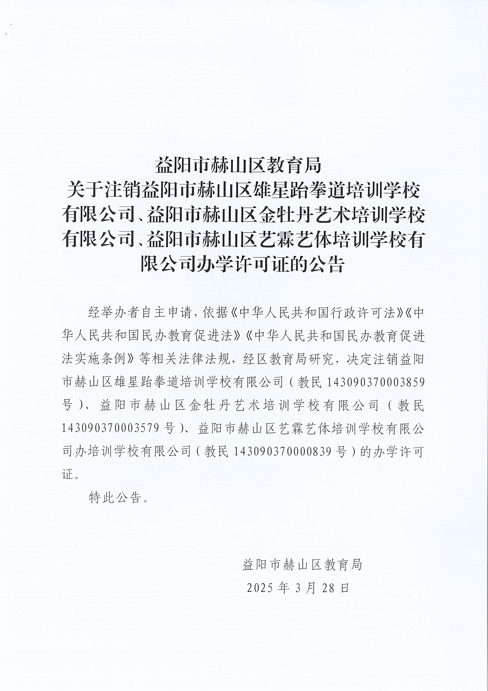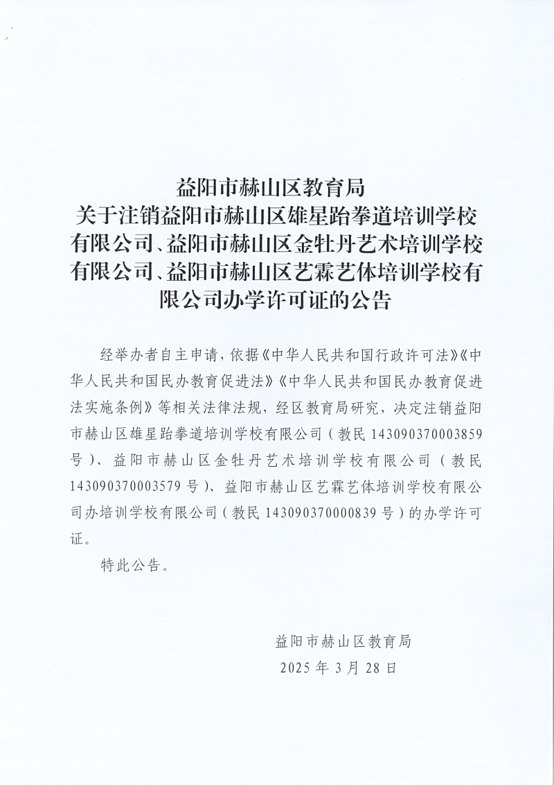 关于注销益阳市赫山区雄星跆拳道培训学校有限公司等3所培训机构办学许可证的公告