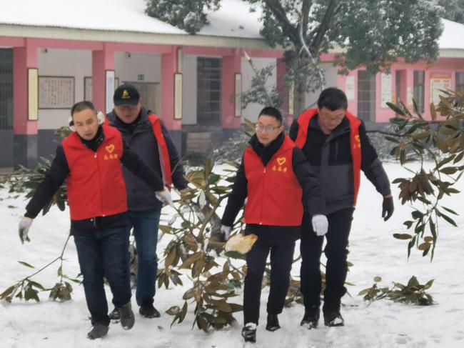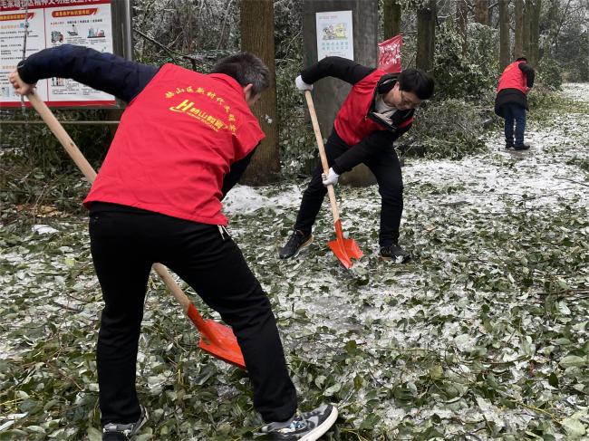 教育系统各单位快速制定了详细的作业计划。志愿者们装备铁锹、铲子、扫把和防滑装备等工具,在学校周边道路、人行道等主要通道进行铲冰除雪工作。面对路上的积雪冰层,大家密切配合、有序分工,用铁锹挑除路面的厚冰层,随后用铲子将松动的冰雪清除干净,并用扫把清扫残留的积雪,撒上工业盐,确保路面不再结冰。大家还配备了锯子和剪刀等工具清理断枝倒树,并对悬挂或倾斜的大枝进行修剪,确保道路安全畅通。