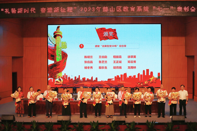 “我志愿加入中国共产党,拥护党的纲领,遵守党的章程,履行党的义务……”会议伊始,区纪委监委派驻区教育局纪检监察组组长罗湘武带领全体与会党员重温入党誓词,句句铿锵誓言,表达了对党的忠诚和为共产主义事业奋斗的坚定信念。会议还表彰了优秀共产党员、优秀党务工作者和先进基层党组织,并为在党50周年的老党员颁发了“光荣在党50年”纪念章和鲜花。“光荣在党50年”纪念章获得者代表陈胡兰、退休党员代表王政强、优秀党员代表毛小平、优秀党务工作者代表何光明、先进基层党组织代表罗双未先后上台发言。