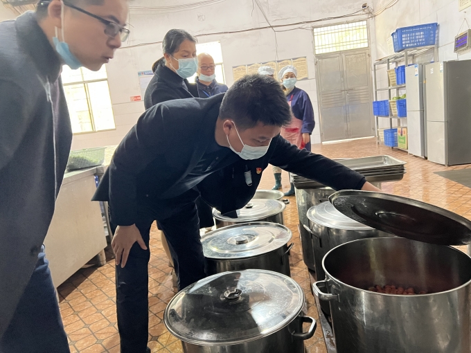 督查组实地查看了食堂操作间和学生餐厅,重点抽查了食品留样、学生食堂进餐和学校“两荤一素一汤”标准落实情况。胡鑫强调,要多举措提高学生伙食质量,保障学生营养均衡。