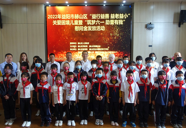 5月31日,赫山区“益行益善、益老益小”关爱困境儿童暨“筑梦六一、助蕾有我”慰问金发放活动在沧水铺镇花亭子学校举行。本次活动由赫山区人民政府指导,区民政局、区慈善总会主办,区教育局、花亭子学校承办,湖南萝蔓食品有限公司、市蚂蚁社会工作服务中心提供协助。