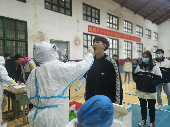 在益阳市第十七中学,工作人员认真核对、登记师生身份信息,医务人员严格按照采样流程进行操作。师生均佩戴口罩,间隔1米距离,分时间段、分批进入检测点,有序接受核酸检测。在笔架山乡中心幼儿园,小朋友们在老师的陪同下有序排队等候,自觉配合医生的工作。在沧水铺镇芙蓉学校,学校行政人员和班主任现场维持秩序,师生有序排队、验码、登记、检测,整个采样现场秩序井然。