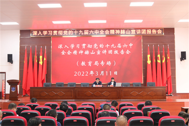 3月11日,赫山区教育系统学习贯彻党的十九届六中全会精神宣讲报告会在益阳师范附属小学多功能报告厅召开。区委宣讲团成员、区委网信办主任夏艳辉受邀作主题宣讲报告。区教育局党组书记、局长任长青主持会议。