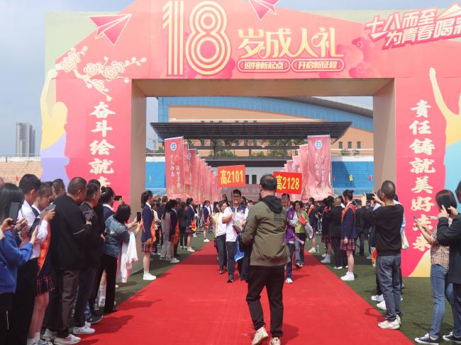 “捍卫神圣宪法,维护法律尊严;勤勉奋发有为,不负人民厚望;以我火红青春,建设锦绣中华;以我壮志豪情,创造崭新未来。”该校1400余名高三学子唱国歌,诵《宪法》,佩戴成人徽章,跨越“成人门”,向青春宣誓,朝未来前行。