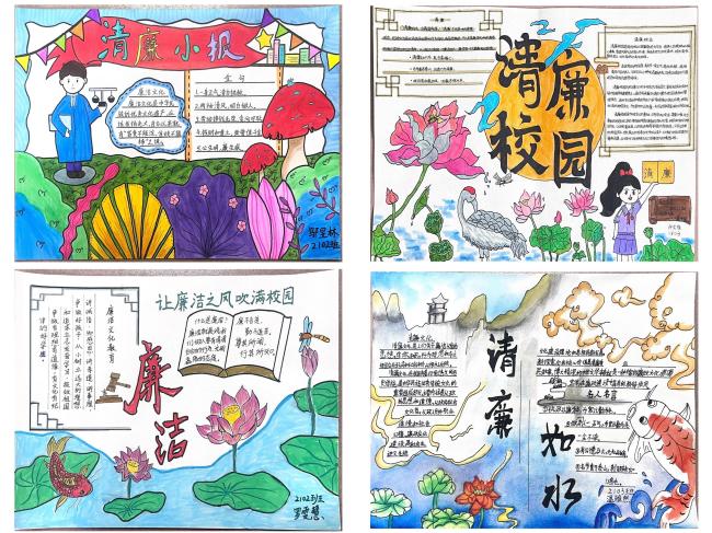 该校三至六年级学生精心制作了构思巧妙、各具特色的手抄报。作品紧贴“清廉文化”主题,或描绘荷花表现“出淤泥而不染”的高洁清气;或以清廉名言警句引人深思,弘扬中华廉洁正气;或以生动活泼的漫画形式表达严肃的清廉教育主题。