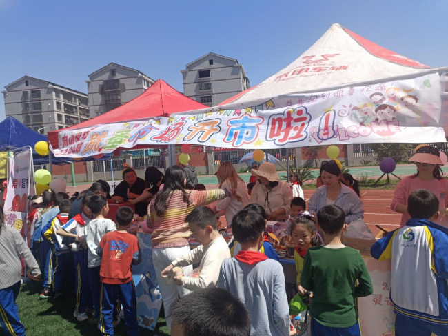 活动现场,学生和家长一起将闲置的书籍、玩具、文具、布娃娃等物品,亲手制作的剪纸、绘画、版画等手工作品以及小吃零食等公开售卖。十五个别具一格的“摊位”整齐排列,琳琅满目的商品吸引了来往路人的目光。活动持续了两个小时,大家带着新购置的物品和美食满足地回到教室。