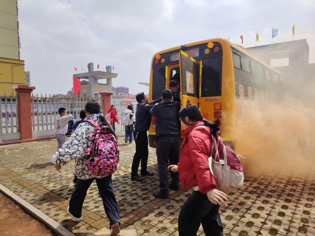 演练在长鸣的警报声中拉开帷幕,烟雾弹释放的浓烟在教学楼中弥漫,学生在班主任带领下,井然有序地撤离教学楼,安全到达操场。在消防官员的现场指导下,师生学习了灭火器的使用方法并进行了实操训练,了解了校车安全乘坐要点及防恐安全技能。