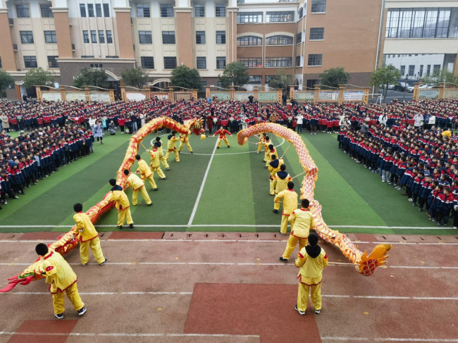 开场舞《鼓舞龙腾》拉开了典礼的序幕。雄壮的鼓声与灵动的舞龙相映成趣,瞬间点燃了现场。1901班带来的《社会主义核心价值观》手势舞优雅而动人,表达出对祖国的热爱。“双龙”巡园送福活动吸引了大家的目光,随着“双龙”巡游,每个班级都充满了祝福与欢声。