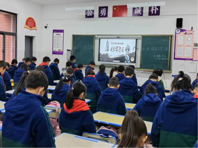 该校各班组织开展“历史不容忘却 未来我们掌握”主题班会课,通过观看南京大屠杀和抗日战争的影像资料,体会抗战胜利的艰辛和不易,感受先辈们经历过的迫害与苦难,让热爱祖国、热爱和平的种子在心灵深处扎根、发芽。“经过此次活动,我直观感受到了战争的残酷。我们牢记历史,不只是记住民族的伤痛,也不是为了宣扬延续仇恨,而是要以史为鉴,唤起每一个善良的人对和平的向往与坚守。振兴中华,吾辈当自强!”该校九年级M2109班学生贺韬鸿激动地说。