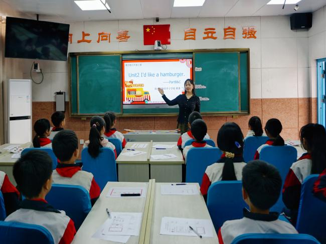 该校教师蔡惠进行了《I’d like a hamburger》公开课展示,她以核心素养为导向,运用该校“5G+智慧教育”设备和湘少版小学英语专属教学平台E英语宝,分享校本教研经验,实现教学评一体化,充分体现了英语学科的育人价值,得到一致好评。