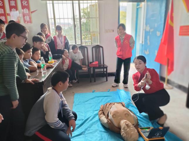 活动现场,该院院前急救科主任刘辉通过PPT演示讲解和现场模拟教学,带大家了解了心肺复苏和海姆立克急救法。学生们仔细聆听、认真观摩,念着七步口诀“呼、叫、看、定、压、抬、吹”练习心肺复苏,比着“剪刀、石头、布”牢记海姆立克急救法。互动环节,学生们踊跃参与现场演练,医院志愿者在旁耐心指导,整个培训过程气氛活跃,大家始终热情高涨。