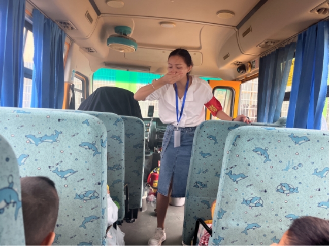 该园幼师讲述了紧急疏散方法,并告知了幼儿逃生路线。照管员燃烧艾叶制造烟雾,让幼儿在更逼真的环境下进行模拟逃生。“起火啦!”校车司机和校车照管员有条不紊打开应急门,组织幼儿顺利逃生并迅速转移到安全地带。最后,司机返回车内检查幼儿是否全部安全撤离。