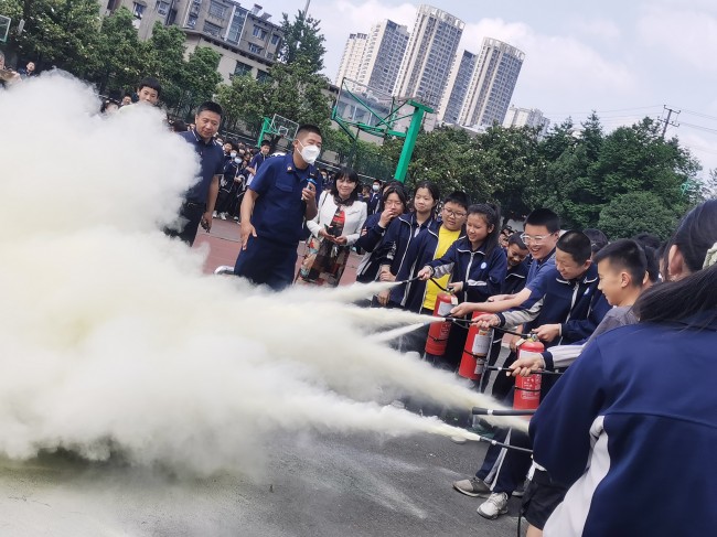 5月24日上午,赫山中学联合区消防救援大队开展消防灭火演练。