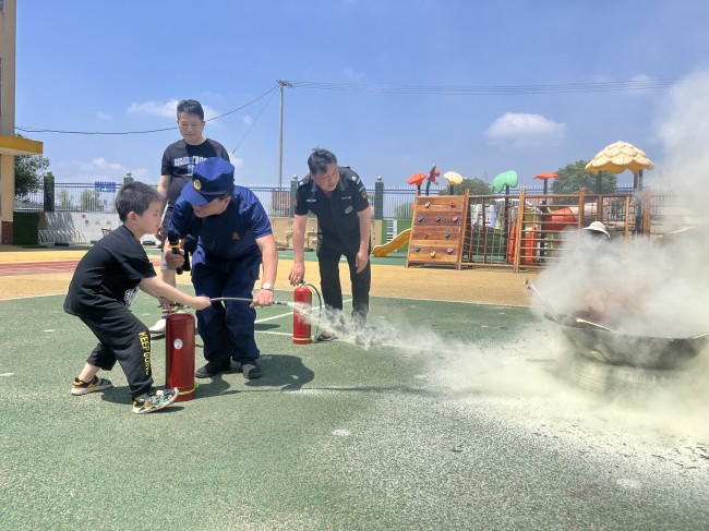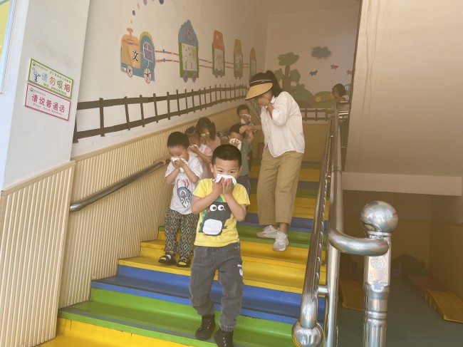 随着警报声响起,教师迅速组织幼儿进行疏散,指导幼儿用湿毛巾捂住口鼻、弯腰下蹲沿墙边有序撤离,从发布撤离命令到全体师生全部撤离至指定安全位置,仅用时1分30秒,顺利完成了任务。随后,该园邀请专业人员指导幼儿学习使用灭火器,幼儿们跃跃欲试,现场气氛活跃。