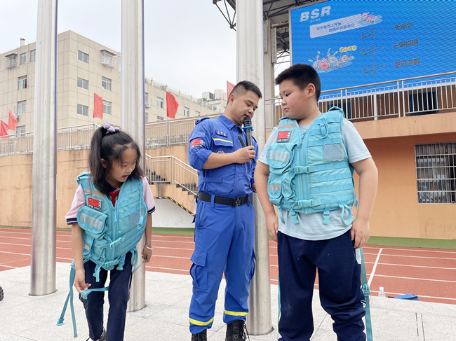 活动中,蓝天救援队教官通过现场讲解、互动问答等形式,详细介绍了防溺水自救自护相关知识,并邀请学生试穿救生衣、体验人工呼吸及胸外心脏按压模拟救护。学生们积极配合,现场气氛十分活跃。