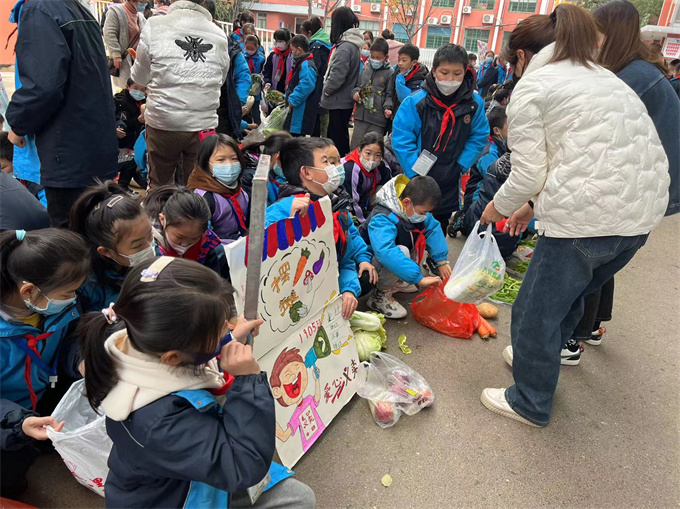 “秀峰路学校蔬菜义卖活动开始了,新鲜无污染的绿色蔬菜,大家快点过来看,过来买哦!”“我们的蔬菜是绿色有机食品,新鲜健康,不含农药哦……”12月15日上午,秀峰路学校组织全体师生开展“校园种植欢乐多 蔬菜义卖真情暖”主题活动。