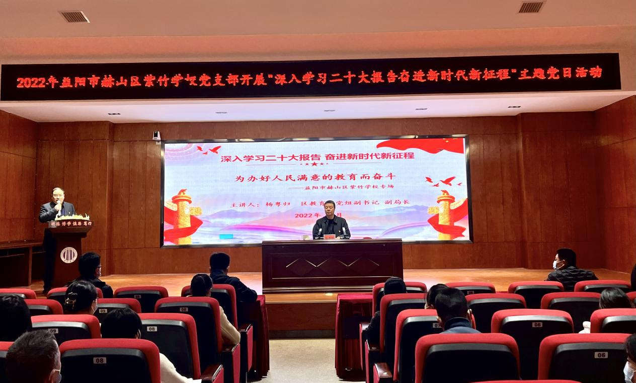 11月17日下午,在赫山区教育局党组的指导下,紫竹学校党支部在会议室组织开展学习党的二十大报告专题党课活动。局党组副书记、副局长杨粤归,局党建办相关负责人受邀出席活动。