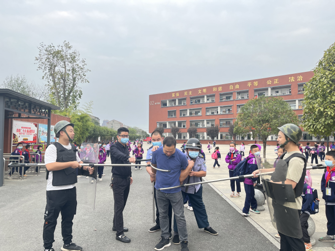 演练前,该校校长、活动总指挥张洁潭组织教职工召开演练动员会议,提醒相关注意事项。随后,在龙光桥街道派出所民警的协助下,学校安保人员讲解并演示了防暴胸叉、防暴脚叉、防暴臂盾、催泪喷雾剂、防刺背心、防割手套等器械的使用。7点20分,演练正式开始。该校模拟了在学生进入校园时,“暴恐分子”开车欲冲向学生和持棍棒冲向学生的场景。校门口值班人员发现后,立马拉响警报,安保人员分成两组,一组身穿防刺背心手持盾牌、防暴叉与暴恐分子对决,同时另一组做好师生的疏散避险工作。抢险救护组严阵以待做好学生的心理疏导和受伤人员的救护工作。 现场处置队员分工明确、行动迅速、配合默契、处置得当,成功将暴恐分子制服,达到预期效果。