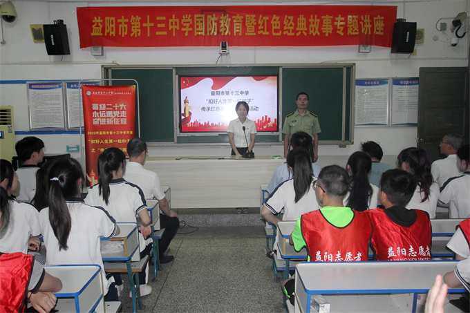 在益阳市第十三中学会议室,中国国防教育专业委员会常务理事、中南大学社会学博士、湖南城市学院副教授刘红星从革命先烈讲到家风传承、从国际国内热点事件延展到国防意义,引经据典、深入浅出地为市第十三中学的师生们呈现了一堂生动精彩的国防教育课。