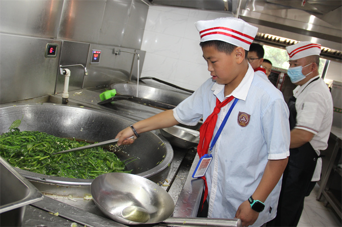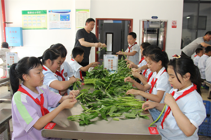 活动中,学生们在老师的带领下采摘自己种植的蔬菜瓜果。只见他们手法娴熟、左右开弓,不一会儿就把成熟的几片菜地的菜采摘完了,整齐的装入菜筐里,并全部运到学校食堂里。在食堂里,学生们在大师傅的指引下,分工合作进行选菜、洗菜、切菜,一会儿工夫就准备完毕。“大厨”来了,几个小朋友自告奋勇穿戴好工作服开始炒菜,只见他们表情严肃、锅铲飞动,动作有模有样,一看就知道是在家里经常帮父母下厨的“劳动小达人”。佳肴上桌后,孩子们邀请了部分老师和学校领导共同用餐,品尝自己几个月以来的“劳动成果”,脸上洋溢着自豪的笑容。