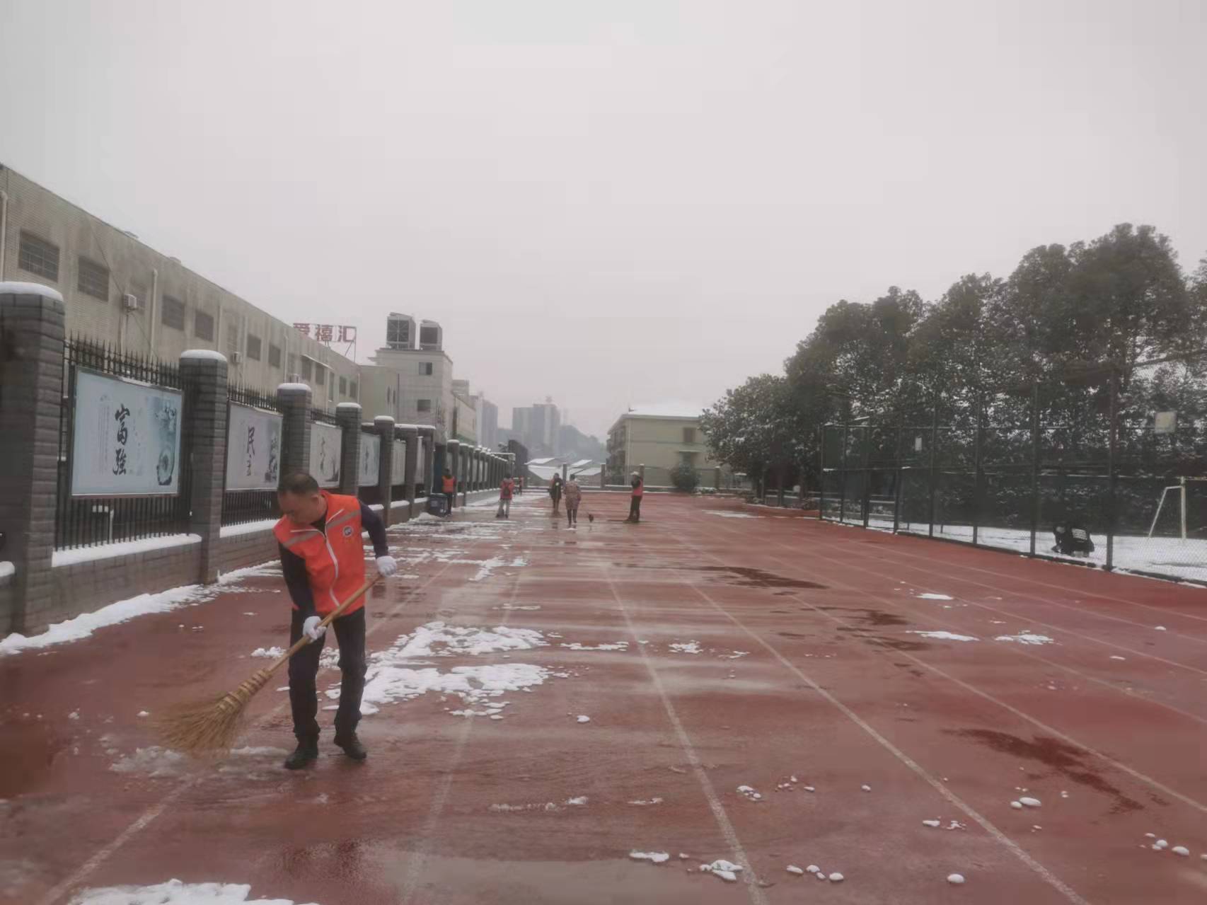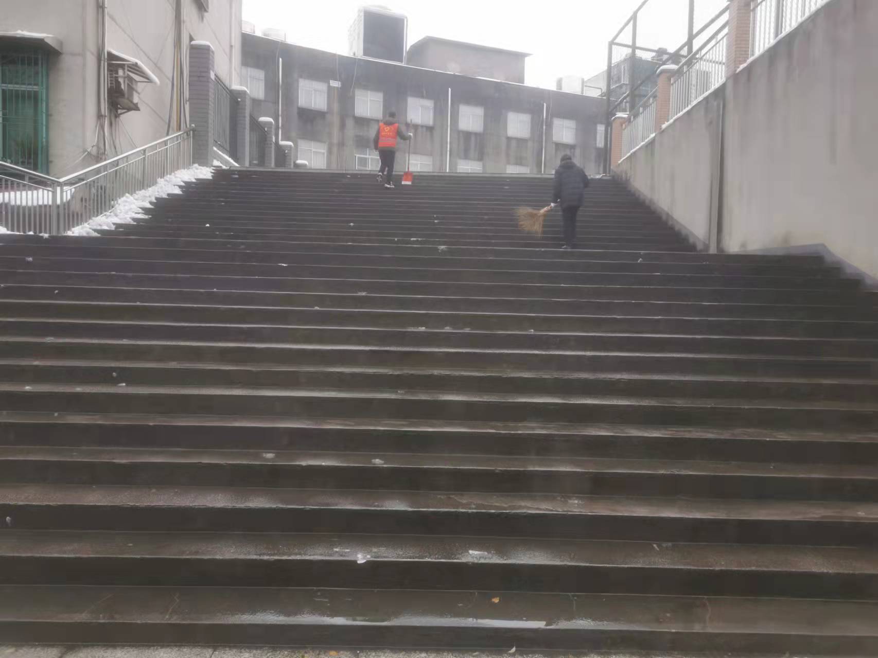 众人拾柴火焰高,师情暖阳融积雪,经过两个下午的奋战,学校门口、主干道、操场及阶梯通道的积雪和冰层都被铲起并集中堆放,为防止夜间路面再次冰冻,后勤安保人员在各个通道上撒上工业盐,彻底消除安全隐患。
