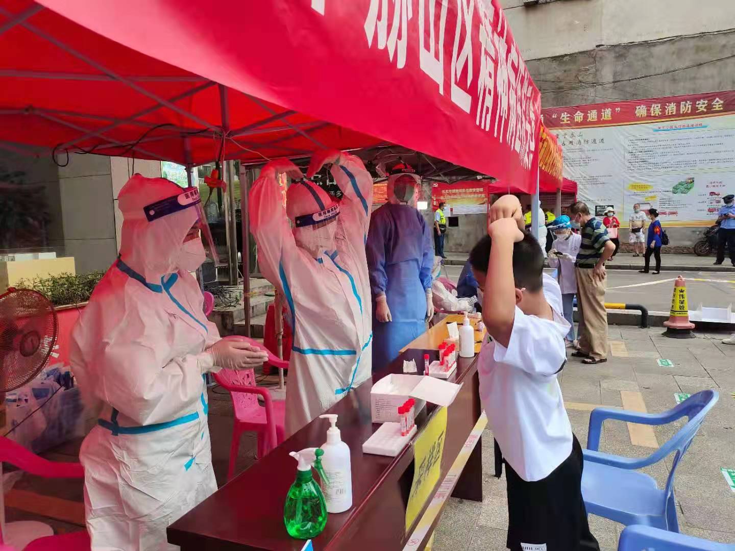 “叔叔阿姨辛苦了!在这么热的天,帮我们做核酸检测,衣服都汗湿了!”近日,赫山区中心城区全员免费核酸检测采样现场,一个小男孩在核酸检测后向医务人员比心,这样美好的一幕被拍了下来,并很快在网上传播开,感动了许多人。