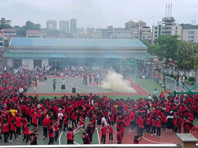 上午10时,演练开始。校园内警笛鸣响,教学楼浓烟滚滚。“请全体师生注意,现在教学楼发生火灾,请大家马上有序撤离。”听到紧急疏散命令,各班班主任迅速带领学生用湿毛巾捂住口鼻,弯着腰,按照预定疏散路线,快速、有序地撤离至安全地带。其他安全管理人员也以最快的速度赶到自己的岗位,指挥各楼层师生安全撤离。整个演练过程井然有序。