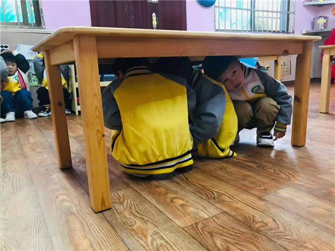 “呜……”伴随着急促的警报声,各班教师立即引导幼儿以最快的速度就近寻找桌子等安全区域躲避。第二次警铃响起后,幼儿在教师的指挥下护住头部、弯腰低身,沿着预定路线,快速有序撤离“危险”地带。到达安全区域后,各班教师迅速清点人数并上报当前情况,确保不丢下任何一名幼儿。整个演练过程快速、安全、有序,用时4分02秒。