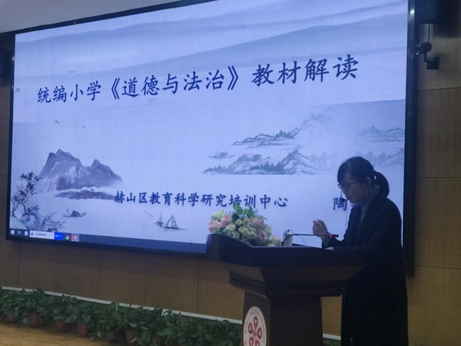 活动紧紧围绕“以人为本,立德树人”这一中心开展,先由该校党员教师欧令娥呈现一年级《道德与法治》课,孩子们在课堂上的精彩表现给现场嘉宾留下了深刻印象。随后,6所学校从教学与管理方面就思政课程开设进行了经验交流,展示了各学校独具特色的思政教育。区教育科学研究培训中心道德与法治教研员陶莉莎作题为《统编小学〈道德与法治〉教材解读》的专题培训,以教材编写背景为切入点,深入浅出地剖析了道法教材的设计意图,通过“纵向连接”与“横向定位”引导教师把握教材设计意图,关注教材的绘本特色,科学构建“一、四、一”道法课堂教学模式,并鼓励教师将理论运用到课堂教育教学实际中,让思政课堂散发特有魅力。