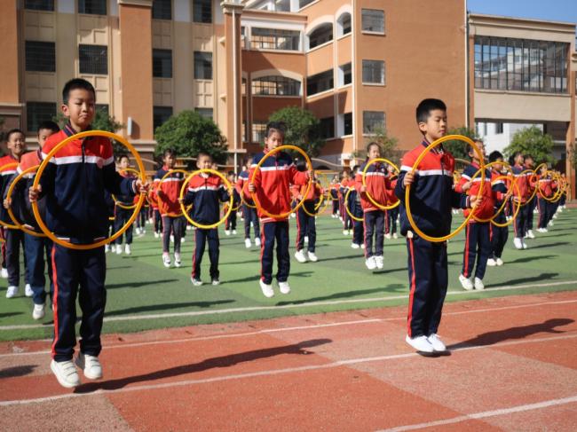 展演中,各学校结合学校传统特色,通过自编集体舞、广播操、养生操、绳操、中华文化礼仪操、跑步等方式,充分挖掘自身优势。在欢快优美的乐曲声中,学生身姿舒展、步伐矫健、动作规范。各学校方阵动静结合,队形富于变化,展现青少年自信、阳光的精神状态,呈现“一校一品”体育教学的丰硕成果。