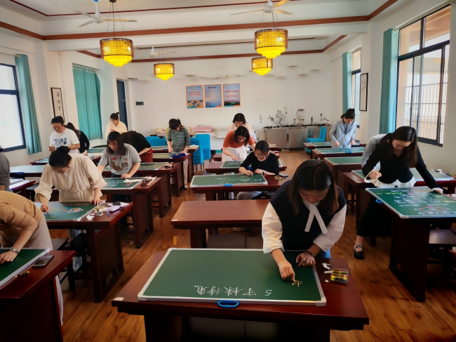 比赛现场,各学科组教师齐聚书法室,以黑板为“画布”,粉笔作“画笔”,巧妙构思、反复推敲,创作出一幅幅层次分明、条理清晰、图文并茂的板书作品。大家运用色彩斑斓的粉笔,通过简洁明了的线条和文字,将复杂的知识点条理清晰地呈现出来,展现出非凡的教学智慧与艺术才华。