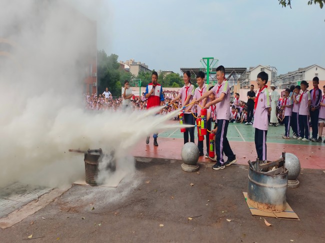 区蓝天救援队现场演示灭火器“提、拔、握、压”四步操作法,并组织学生代表实操演练。六年级李景灏在实操后深有感触:“今天我非常高兴,真正感受到专业救援的力量,这次‘零距离’学习让我掌握了实用技能。”