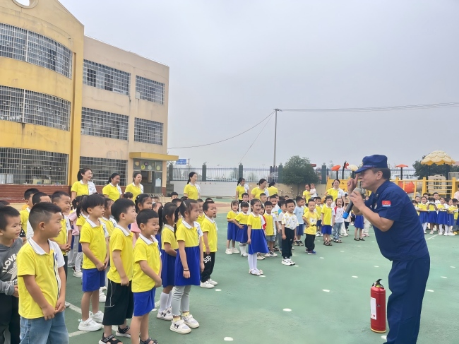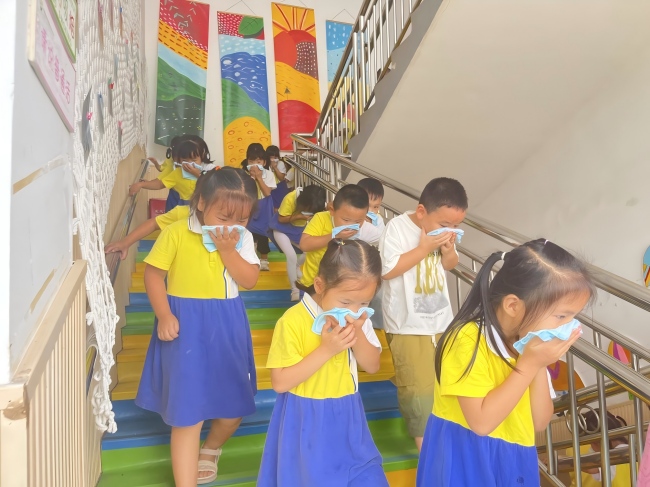 10月11日,泉交河镇中心幼儿园组织开展火灾应急逃生演练。