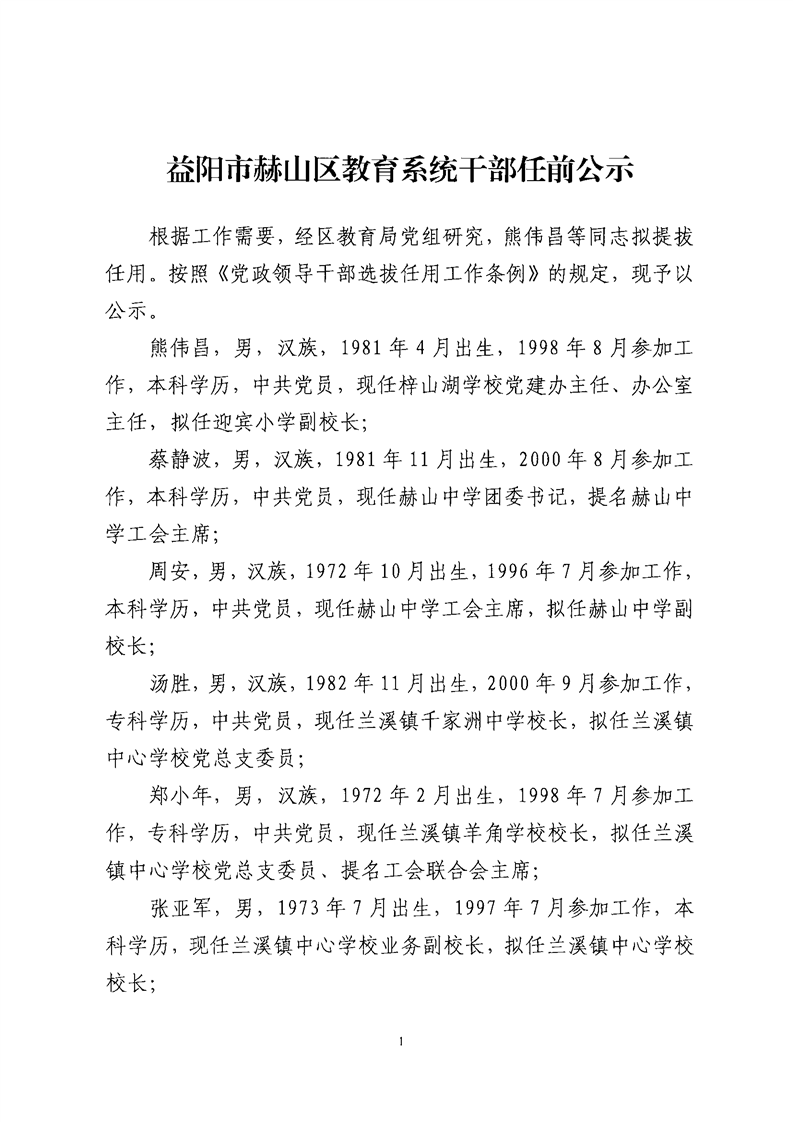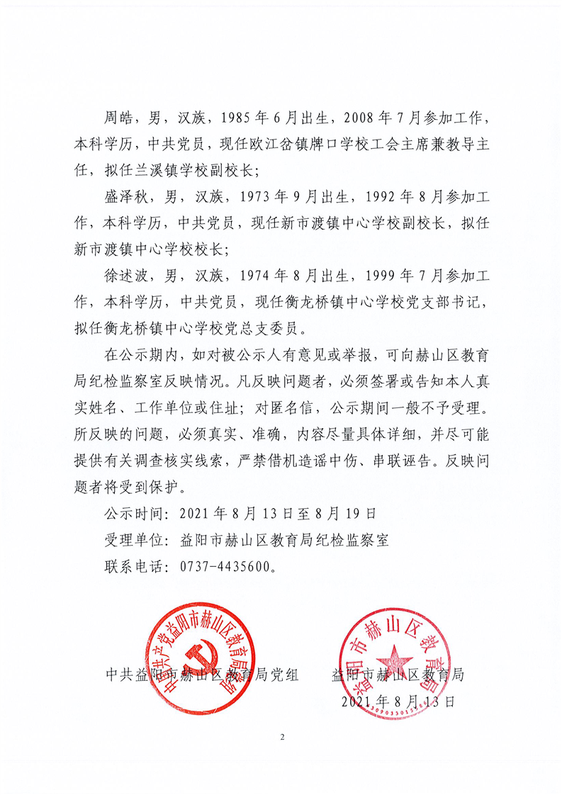 益阳市赫山区教育系统干部任前公示(2021年8月13日)