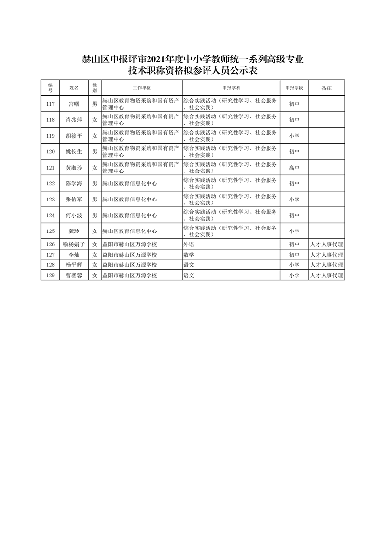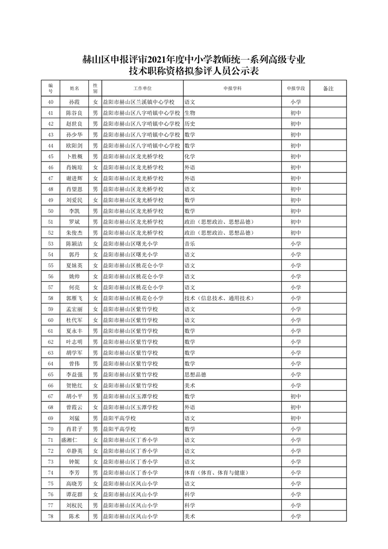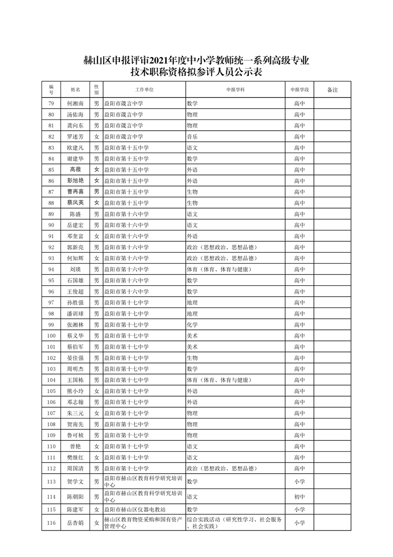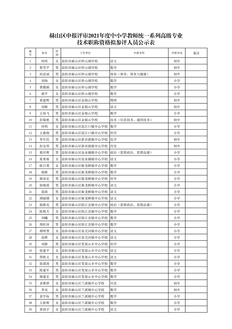 赫山区 2021 年中小学教师系列高级教师职称评审拟推荐参评人员名单公示