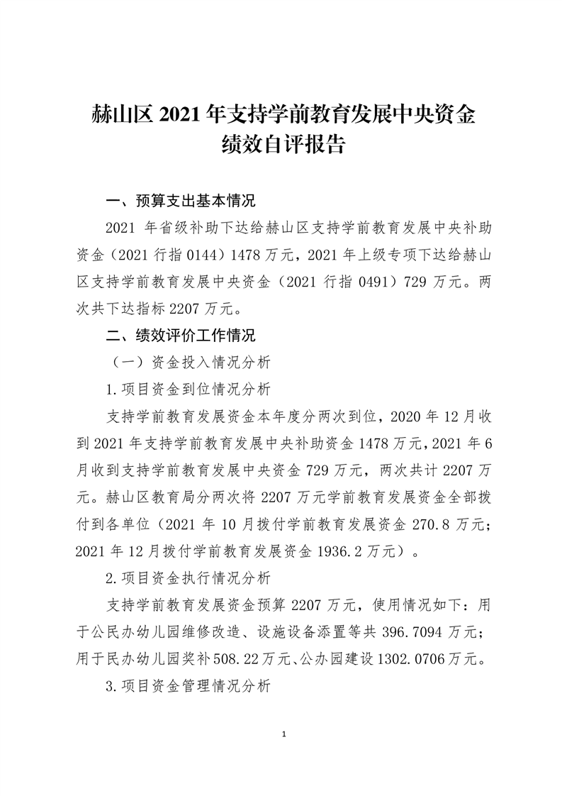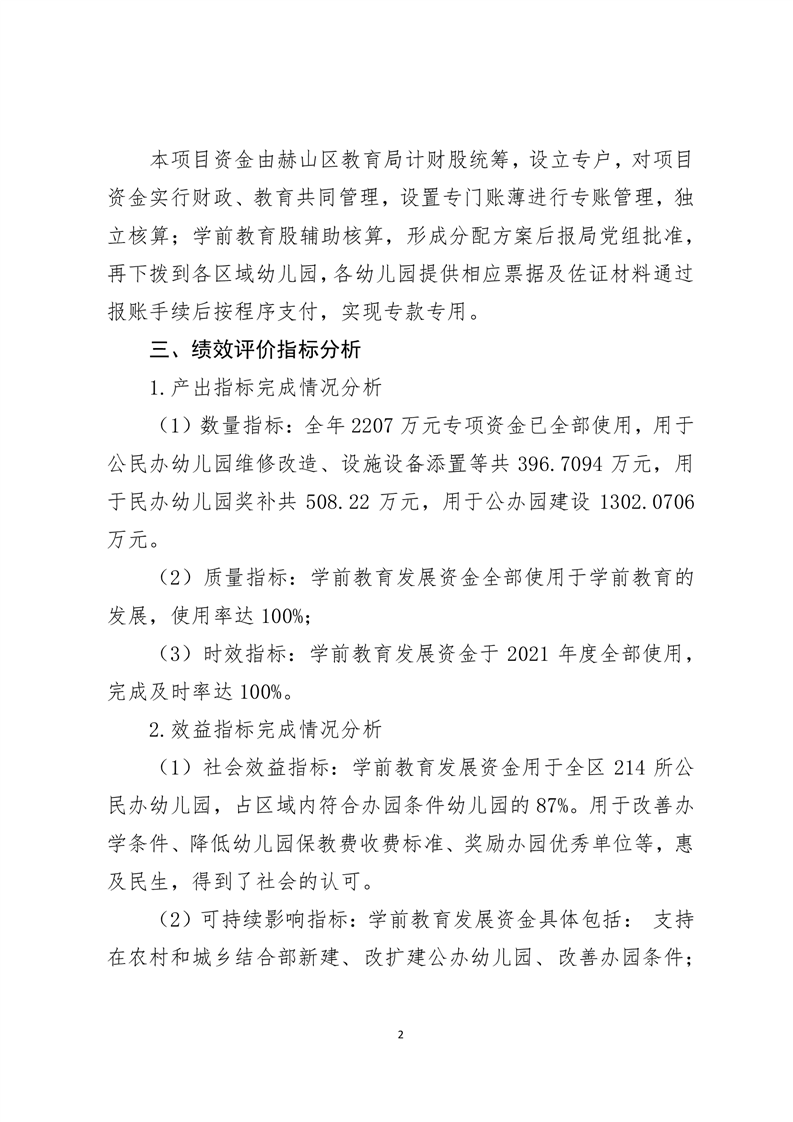 赫山区 2021 年支持学前教育发展中央资金 绩效自评报告