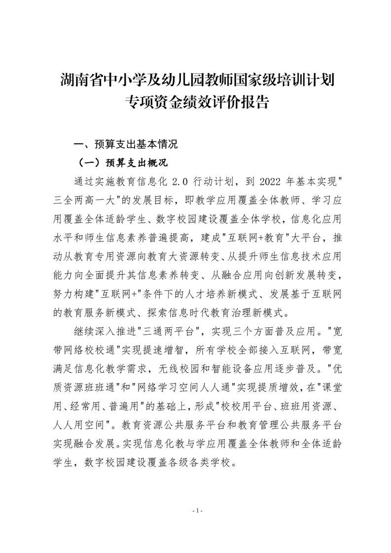 湖南省中小学及幼儿园教师国家级培训计划 专项资金绩效评价报告