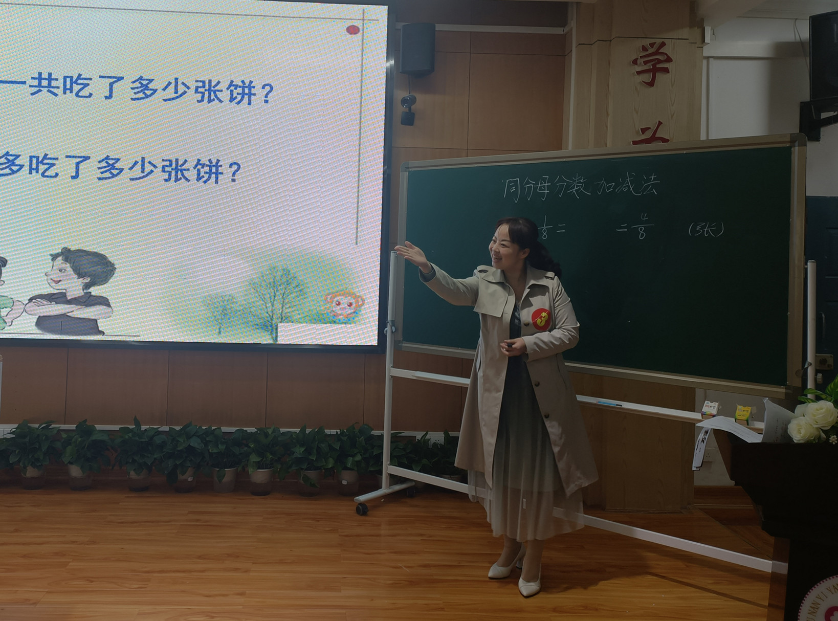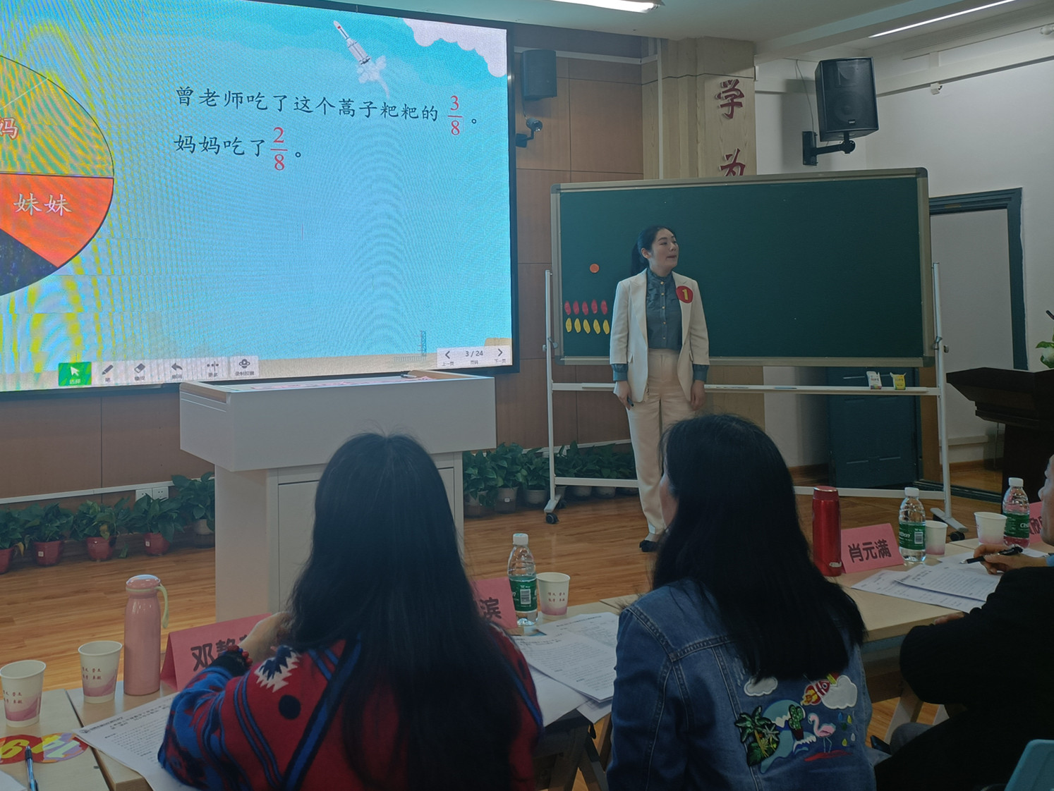 竞赛活动从下午1点整正式开始,迎宾小学教师曾丹作为第一位选手登台上课。她以春季全家吃蒿子粑粑的生活情境导入“同分母分数加减”这一上课内容,让评委和现场听课教师眼前一亮,直接把现场气氛带到了真实的学习情境中。接着,各选手或将微课融入课堂,或利用合作学习卡引导“学生”展开合作探究、或设置游戏将课堂练习趣味化、或将中国古代智慧巧妙衔接现代教学……各逞其能中,课堂教学智慧迭出,现场听课老师们掌声不断。经过整整一下午的角逐,最终迎宾小学教师曾丹等七人获得一等奖。