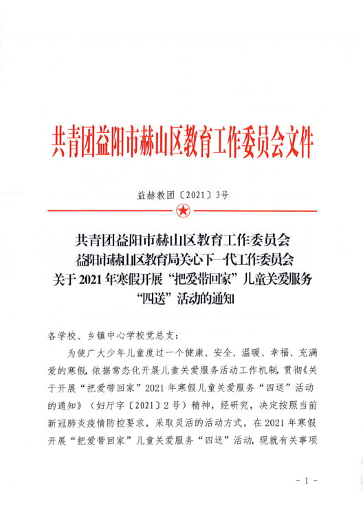 共青团益阳市赫山区教育工作委员会 益阳市赫山区教育局关心下一代工作委员会关于2021年寒假开展“把爱带回家”儿童关爱服务“四送”活动的通知