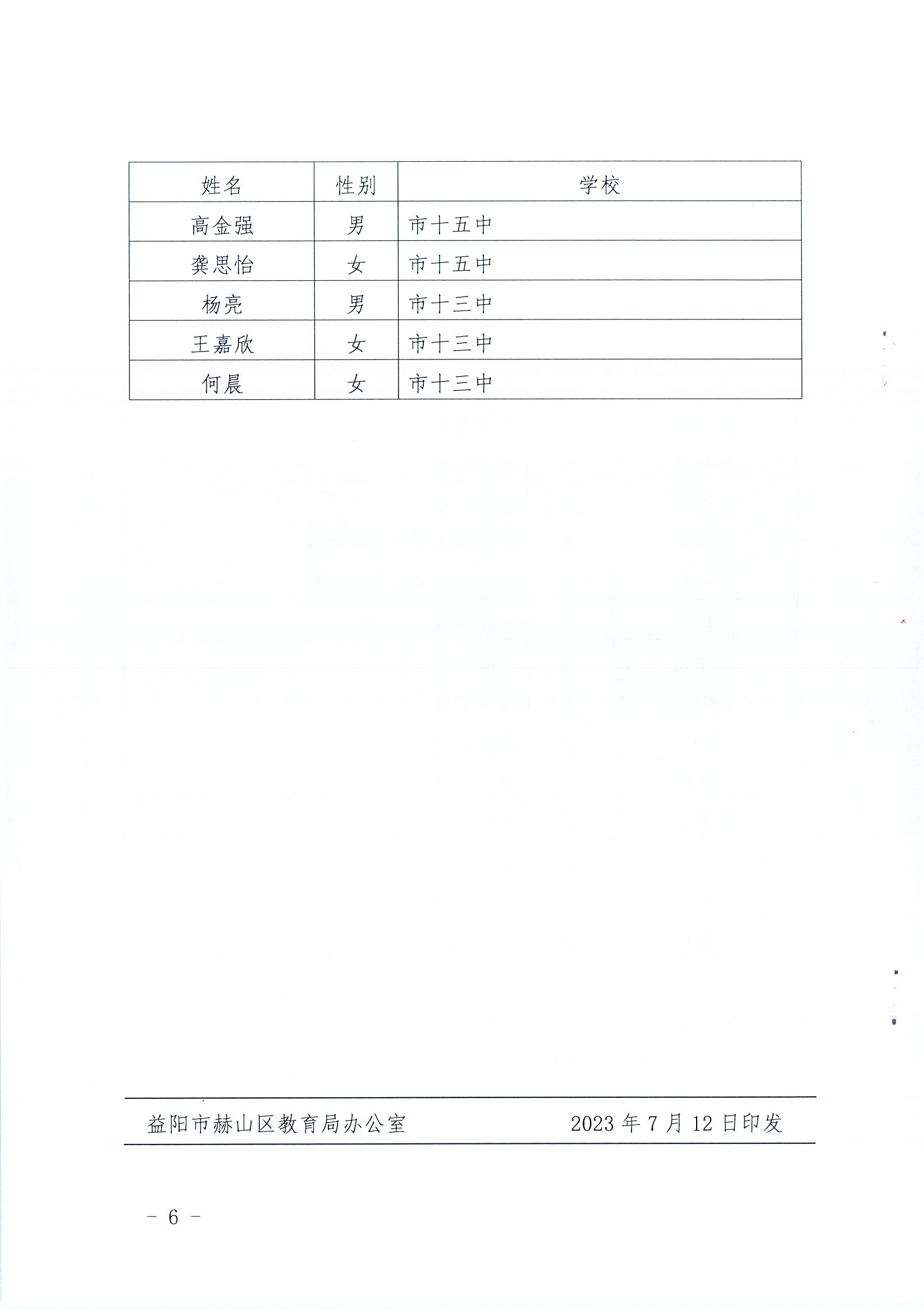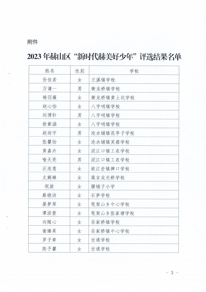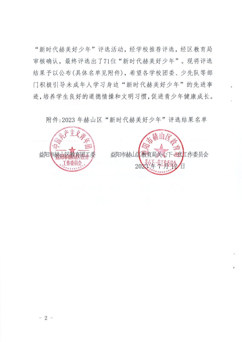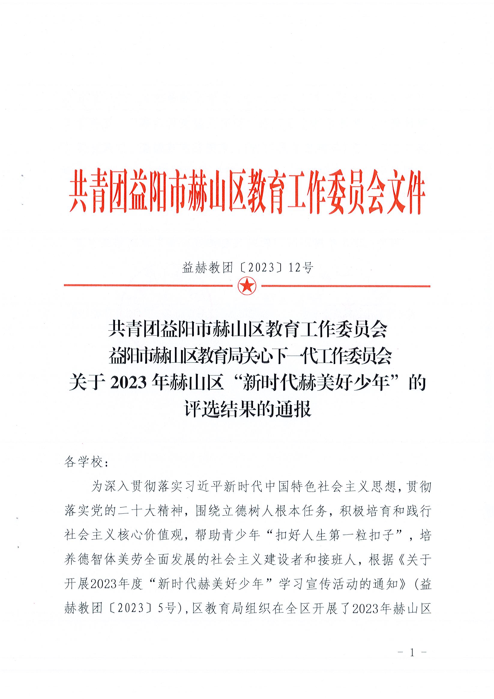 共青团益阳市赫山区教育工作委员会 益阳市赫山区教育局关心下一代工作委员会关于2023年赫山区“新时代赫美好少年”的评选结果的通报