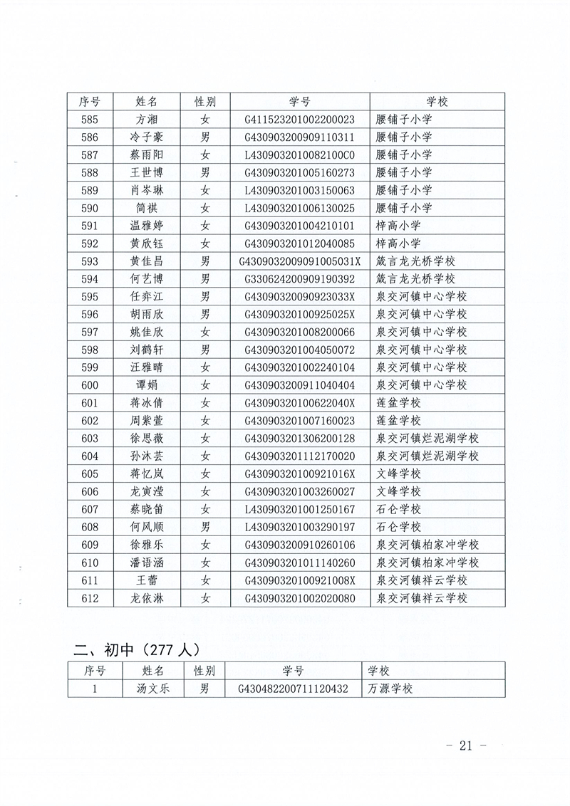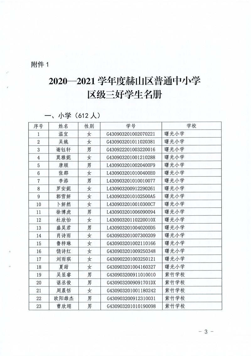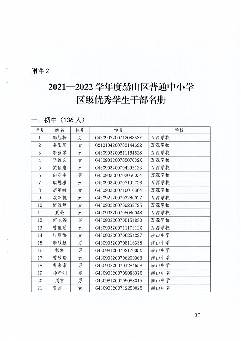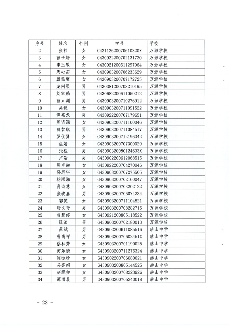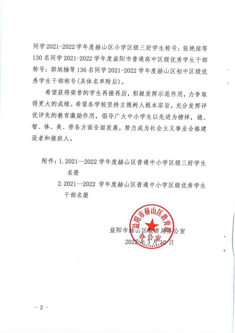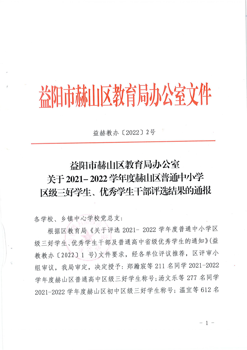 益阳市赫山区教育局办公室关于2021-2022学年度赫山区普通中小学区级三好学生、优秀学生干部评选结果的通报