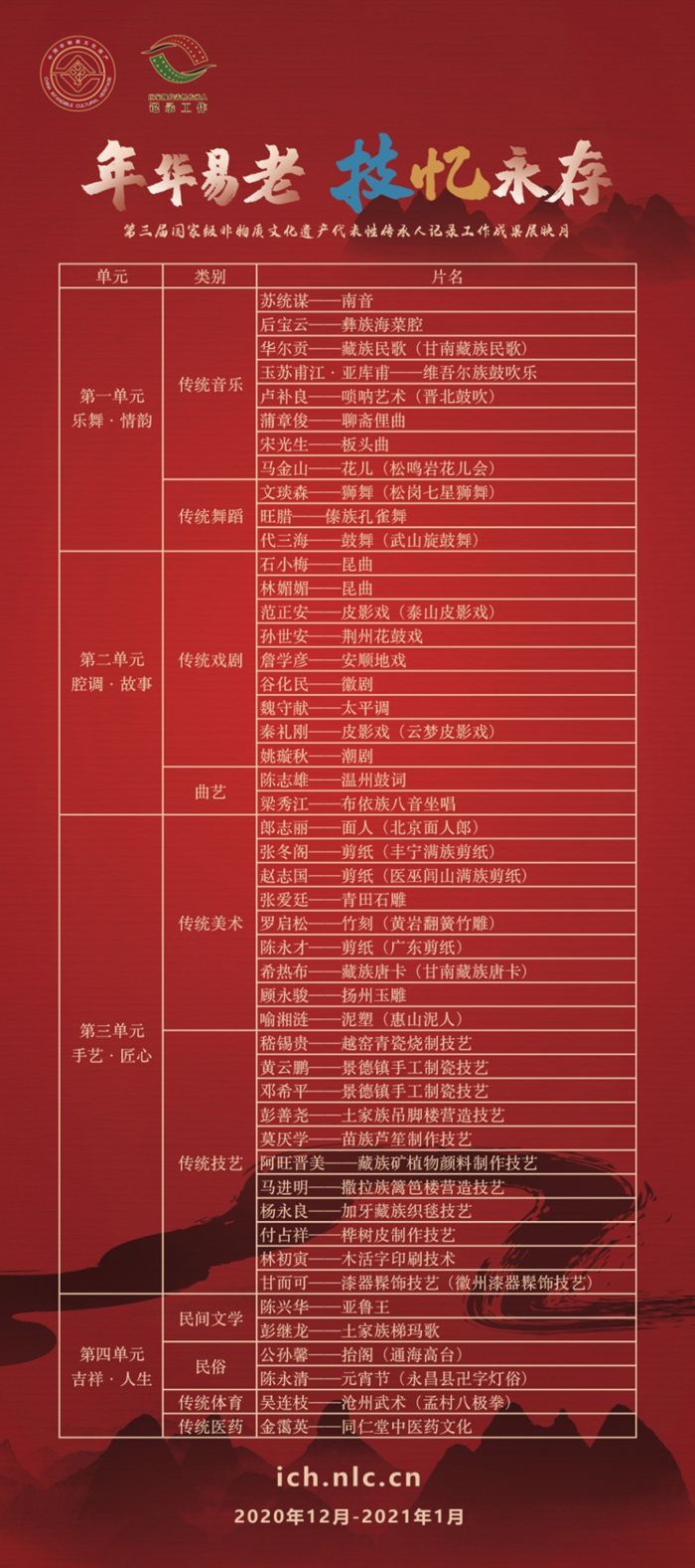 本次系列活动主要以线上平台展映的形式,共分为“乐舞·情韵”“腔调·故事”“手艺·匠心”“吉祥·人生”四个单元,覆盖非遗十大类别,整合了传承人记录工作成果中具有较高艺术性和传播性的综述片,通过传承人项目实践、传承教学和口述采访等影音内容,立体展示了国家级非遗传承人的生活环境、成长经历和技艺习得、教学、传承的历程。