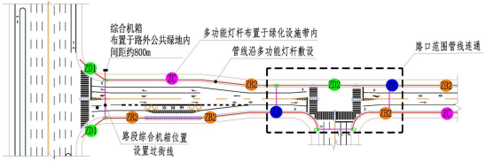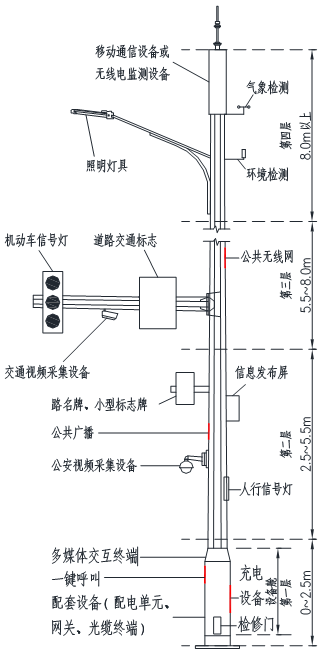 支线布设示意图 (2)挂载设备分层布局 第一层:高度0-2.5m,适用检修门、配套设备(配电单元、网关、光缆终端)、充电设备、多媒体交互终端、一键呼叫等设备; 第二层:高度2.5m-5.5m,适用路名牌、人行信号灯和交通标志、安防监控、信息发布屏、公共广播等设备; 第三层:高度5.5m-8m,适用机动车信号灯、监控、交通标志和公共无线网等设备; 第四层:高度8m以上,适用照明灯具、通信设备、气象环境监测、无线电监测等设备。