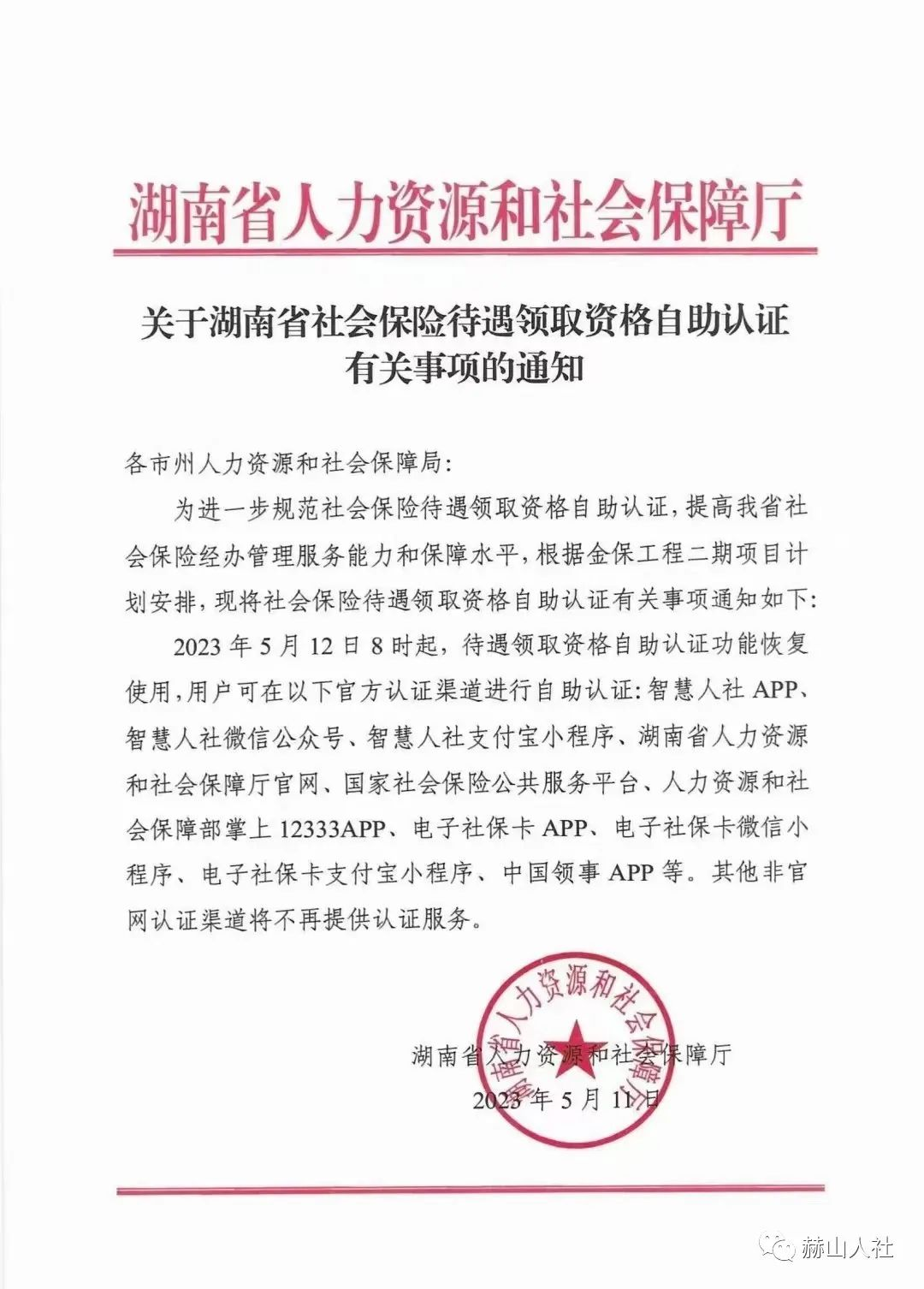 关于湖南省社会保险待遇领取资格自助认证有关事项的通知