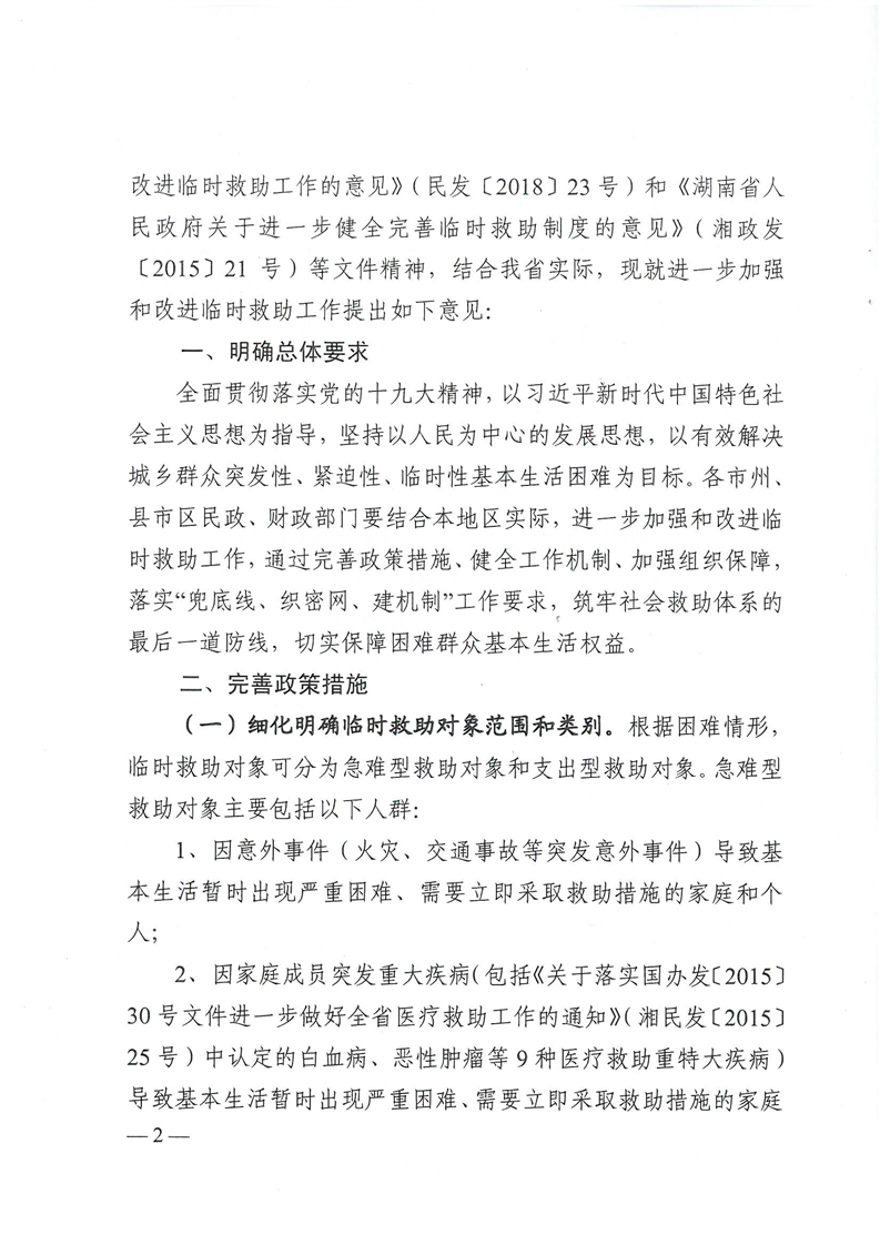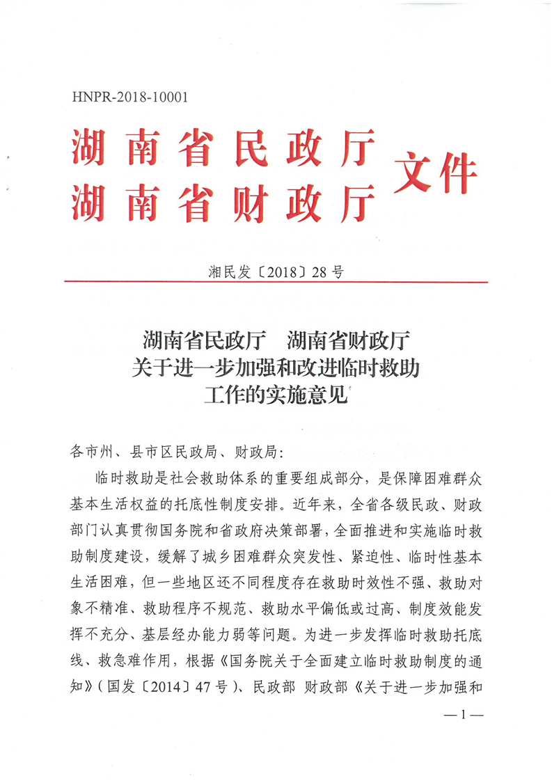 湖南省民政厅 湖南省财政厅关于进一步加强和改进临时救助工作的实施意见